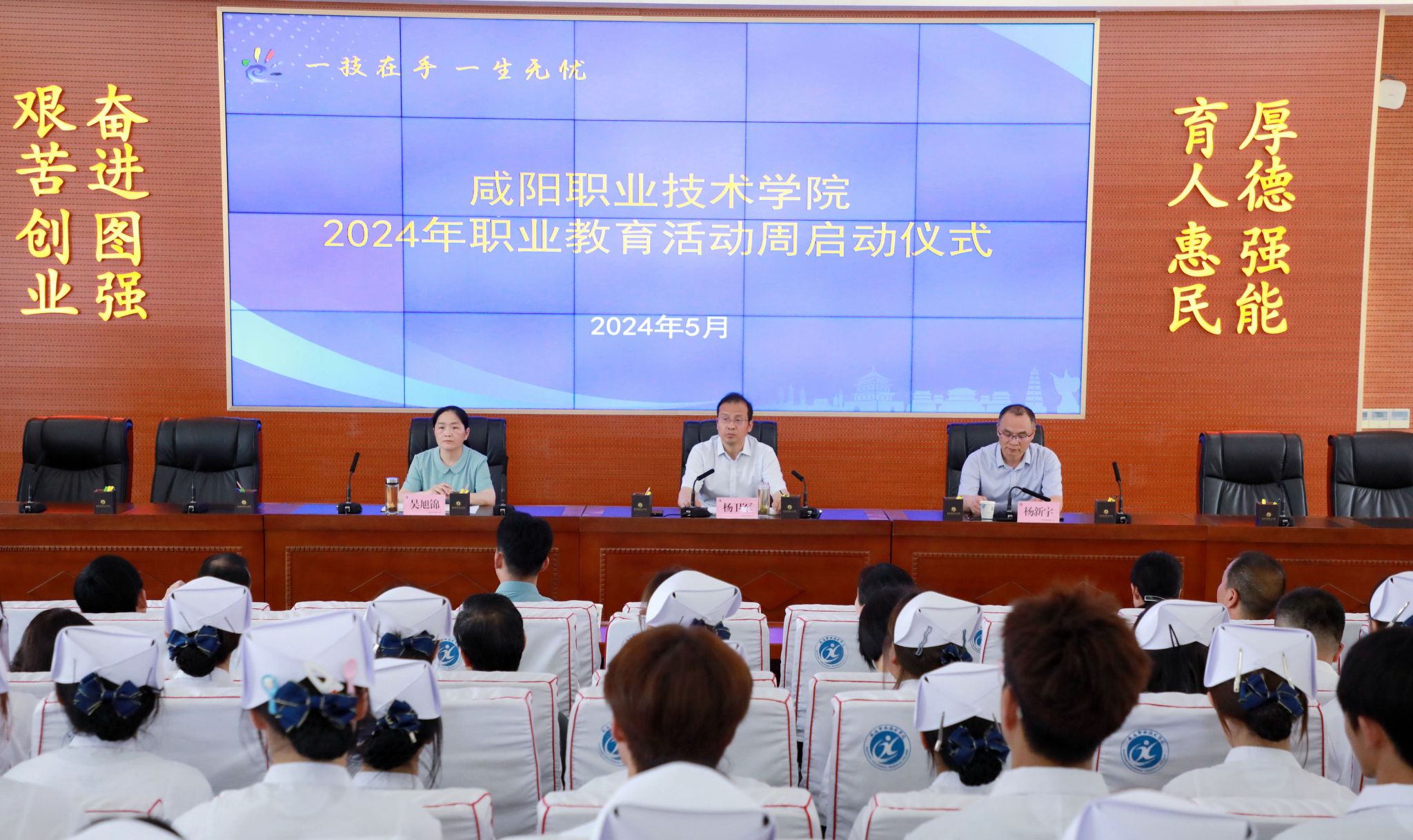 5月16日,咸阳职院举行“一技在手,一生无忧”2024年职业教育活动周启动仪式。学院院长杨卫军,副院长杨新宇、吴旭锦,教务处、各二级学院负责人,企业代表,优秀毕业生代表及学生代表参加启动仪式。副院长杨新宇主持启动仪式。