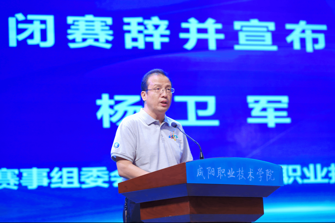 学院院长杨卫军致辞并宣布闭赛。在致辞中代表咸阳职院全体师生向教育部、大赛组委会、执委会、陕西省教育厅、咸阳市委、市政府的大力支持表示衷心感谢。向为大赛付出辛勤努力的全体专家、裁判员、领队、指导老师、工作人员和志愿者致以诚挚慰问。向所有参赛选手展示的良好风貌和取得的优异成绩表示热烈祝贺。