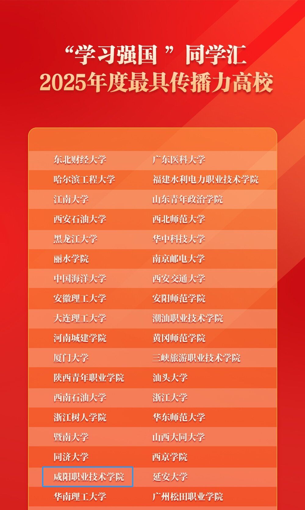 近日,“学习强国”同学汇2025年度评选结果揭晓,咸阳职院被中宣部宣传舆情研究中心、“学习强国”学习平台授予“学习强国”同学汇“2025年度最具传播力高校”荣誉称号。