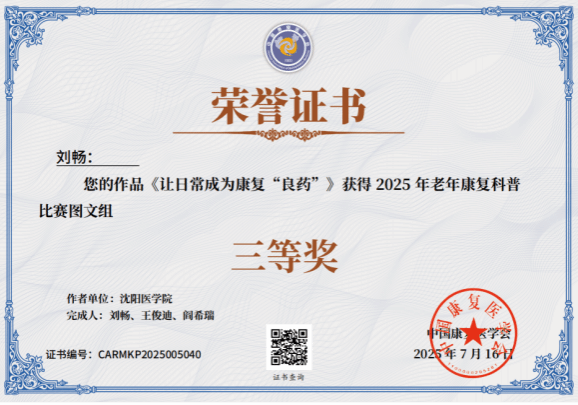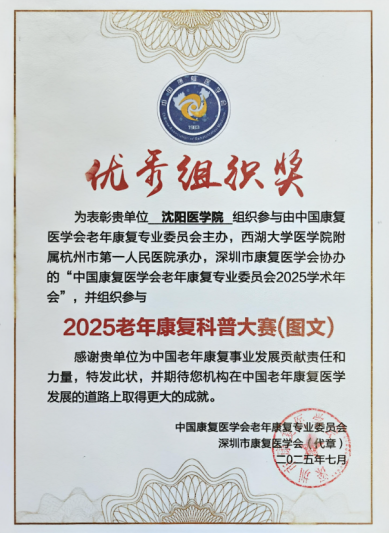 2025年7月12日,由中国康复医学会老年康复专业委员会主办、西湖大学医学院附属杭州第一人民医院承办的2025年老年康复科普大赛决赛在杭州成功举行。经过激烈角逐,我院刘畅、王俊迪、阎希瑞三位同学组建的ac米兰官网中文网站代表队凭借出色的表现,斩获大赛图文类三等奖,ac米兰官网中文网站荣获优秀组织奖。