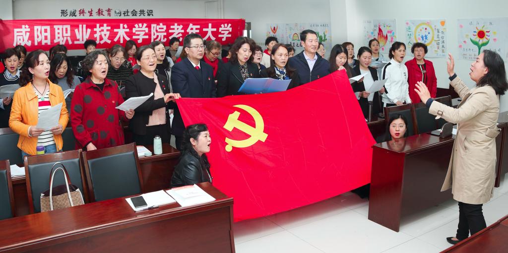 4月22日下午,继教学院党总支“学党史 唱红歌 坚定信念跟党走”主题党日活动走进咸阳职院老年大学合唱班。继教学院全体党员,合唱团艺术总监、授课教师及合唱班老年朋友参加活动。